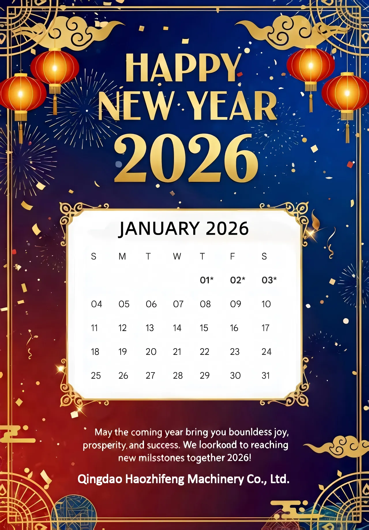 নতুন বছর 2026 আপনার জন্য আনন্দ, সাফল্য এবং সমস্ত সৌভাগ্য নিয়ে আসুক! আমরা নতুন বছরে আপনার সাথে হাতে হাত মিলিয়ে কাজ চালিয়ে যাওয়ার এবং একসাথে আরও উজ্জ্বল অর্জন তৈরি করার জন্য উন্মুখ।
